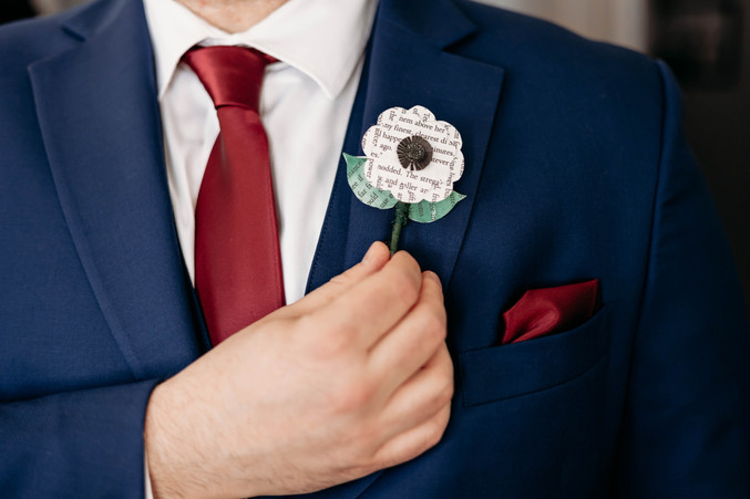 Kaetlyn's dress was the epitome of sparkle and glamour, making her shine like a princess in a fairytale. She hand-made the bouquets and boutonnieres out of paper from books, adding personal touches like a photo of her cousin and a blue shell symbolizing their shared love for a video game. The navy and maroon red color scheme popped against the snowy backdrop, creating a picturesque scene that perfectly complemented their love story.